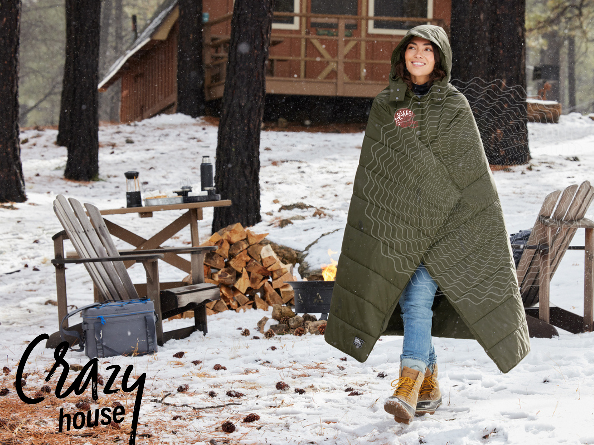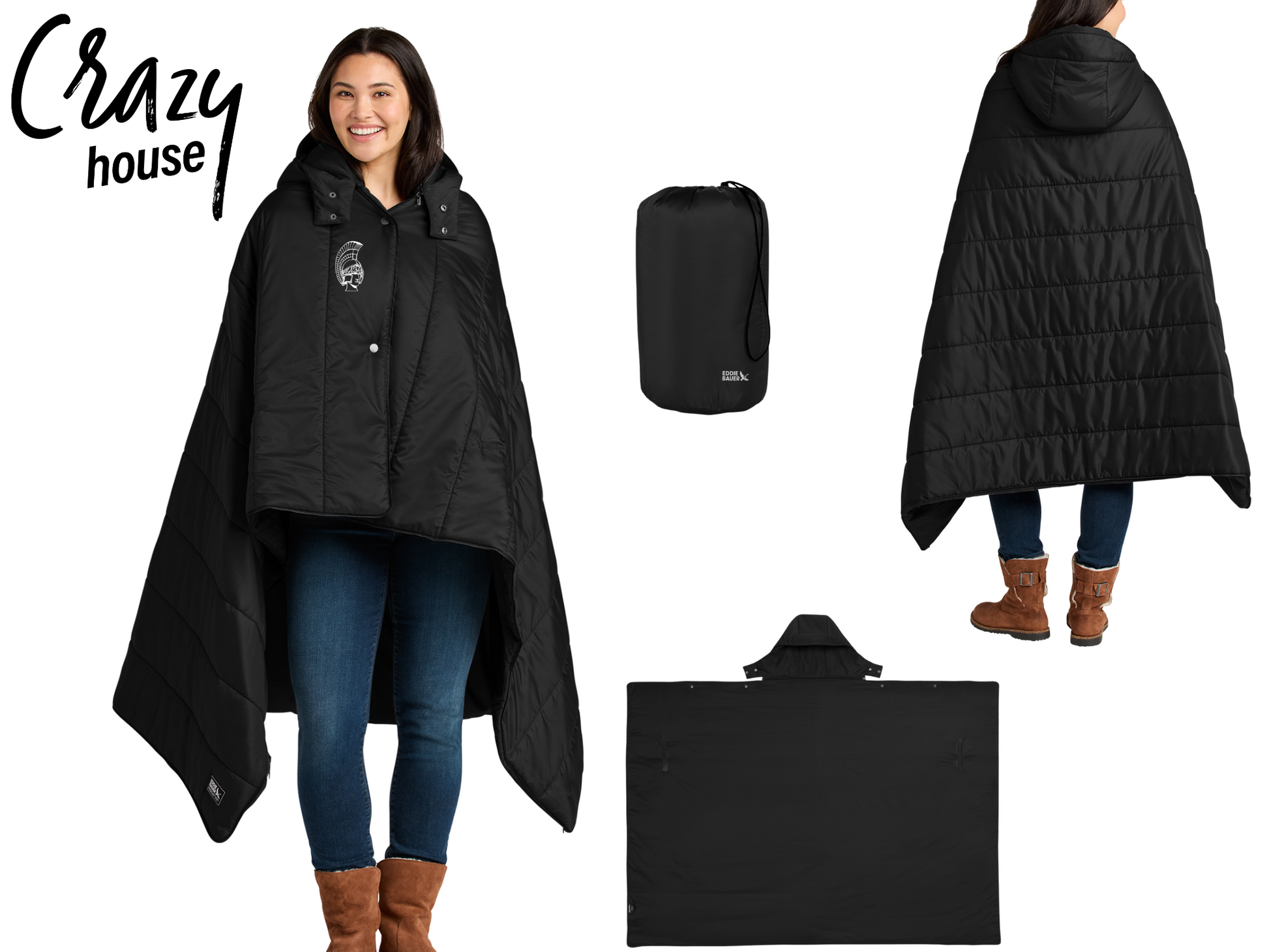 This design comes on Black (color) Eddie Bauer Puffy Poncho. You'll forget what games were like in the cold! Is it a poncho or a blanket? It’s both! This versatile, packable poncho blanket is water-resistant and ready for adventures—both indoors and out.