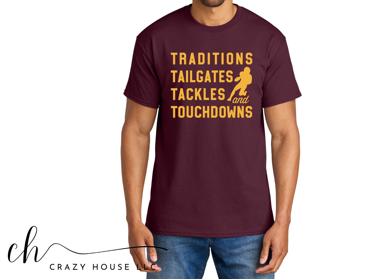 This design comes on a Maroon or Gold (color) Gildan tee. It will quickly become your favorite shirt!